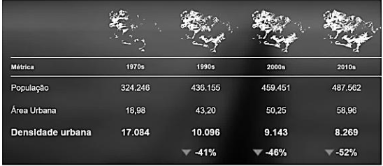 ( ) De 1990 a 2010 a densidade urbana decaiu constantemente, o que significa que o espraiamento urbano cresceu proporcionalmente mais rápido do que o ritmo de crescimento demográfico, fazendo com que a infraestrutura urbana esteja mais disponível e seja mais barata para a população.