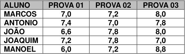 Em uma avaliação cinco alunos realizaram três provas como descrito na tabela abaixo: A média aritmética é utilizada para definir o melhor desempenho entre os alunos e neste caso é a média do aluno: