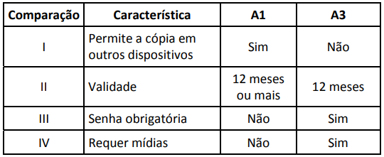 Segundo o Guia Prático EFD-ICMS/IPI, os arquivos digitais devem ser assinados por meio de certificado digital, tipo A1 ou A3. Na tabela de referência a seguir, considere as comparações sobre esses dois tipos. Dessas comparações, estão corretas